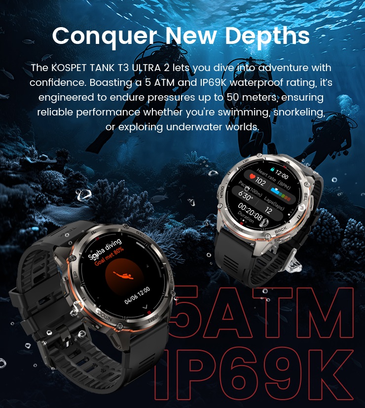 - ضد آب: ساعت هوشمند کاسپت Tank T3 Ultra2 با استاندارد ضد آب 5ATM طراحی شده است که به کاربران امکان میدهد از آن در هنگام شنا یا دوش گرفتن نیز استفاده کنند. این ویژگی باعث میشود که کاربران بدون نگرانی از آسیب دیدن ساعت، در هر شرایطی از آن استفاده کنند.