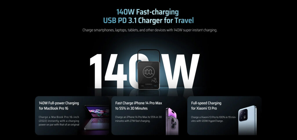 خروجی تک پورت 140 واتی شارژ خودکار را سریعتر می کند و پاوربانک را تنها در 2.5 ساعت به طور کامل شارژ می کند. سازگار با PD3.1 و پروتکل های دیگر که می تواند همان خروجی 140 وات را به عنوان شارژر اصلی مک بوک پرو 16 اینچی ارائه دهد.